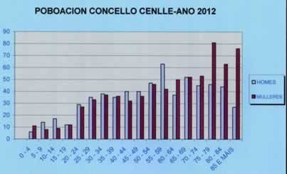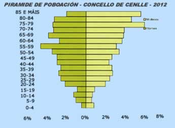 Segundo os datos do IGE para todo o municipio de Cenlle a distribución da poboación actual por idade, ofrece unha pirámide invertida, xa que hai unha gran caída de taxa de natalidade e un aumento da taxa de mortalidade.